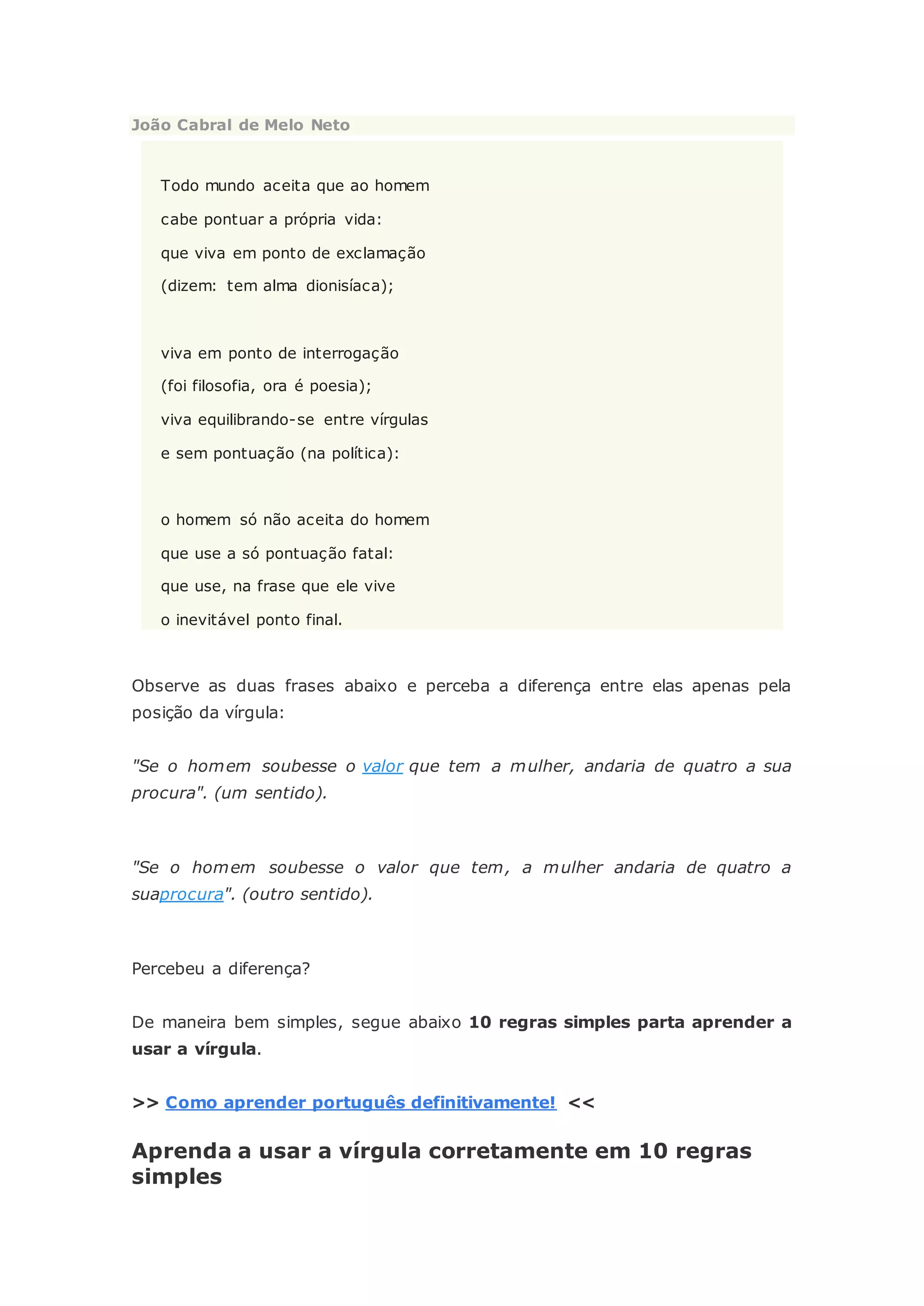 O poema descreve como cada pessoa escolhe viver sua vida, pontuando-a com exclamação, interrogação ou vírgulas. No entanto, ninguém aceita que outro homem escolha viver sua vida com um ponto final. O texto também explica a importância da vírgula para mudar o sentido de uma frase e fornece 10 regras básicas para o uso correto da vírgula na língua portuguesa.