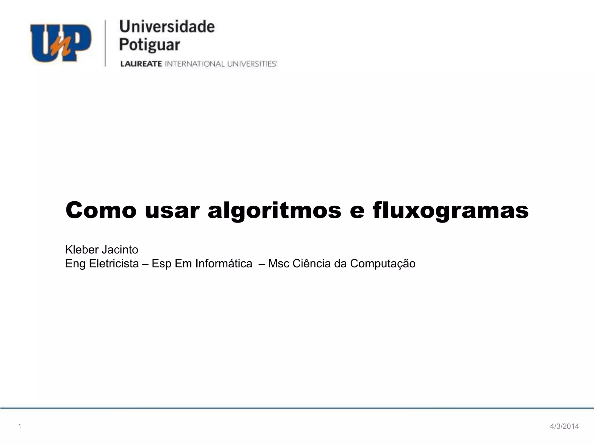 O documento explica como algoritmos e fluxogramas podem ser usados para descrever a solução de problemas. Eles permitem determinar valores de variáveis, realizar operações matemáticas, tomar decisões usando lógica booleana, repetir ações e mostrar resultados. É importante que tudo seja explicado claramente sem deixar nada subentendido.
