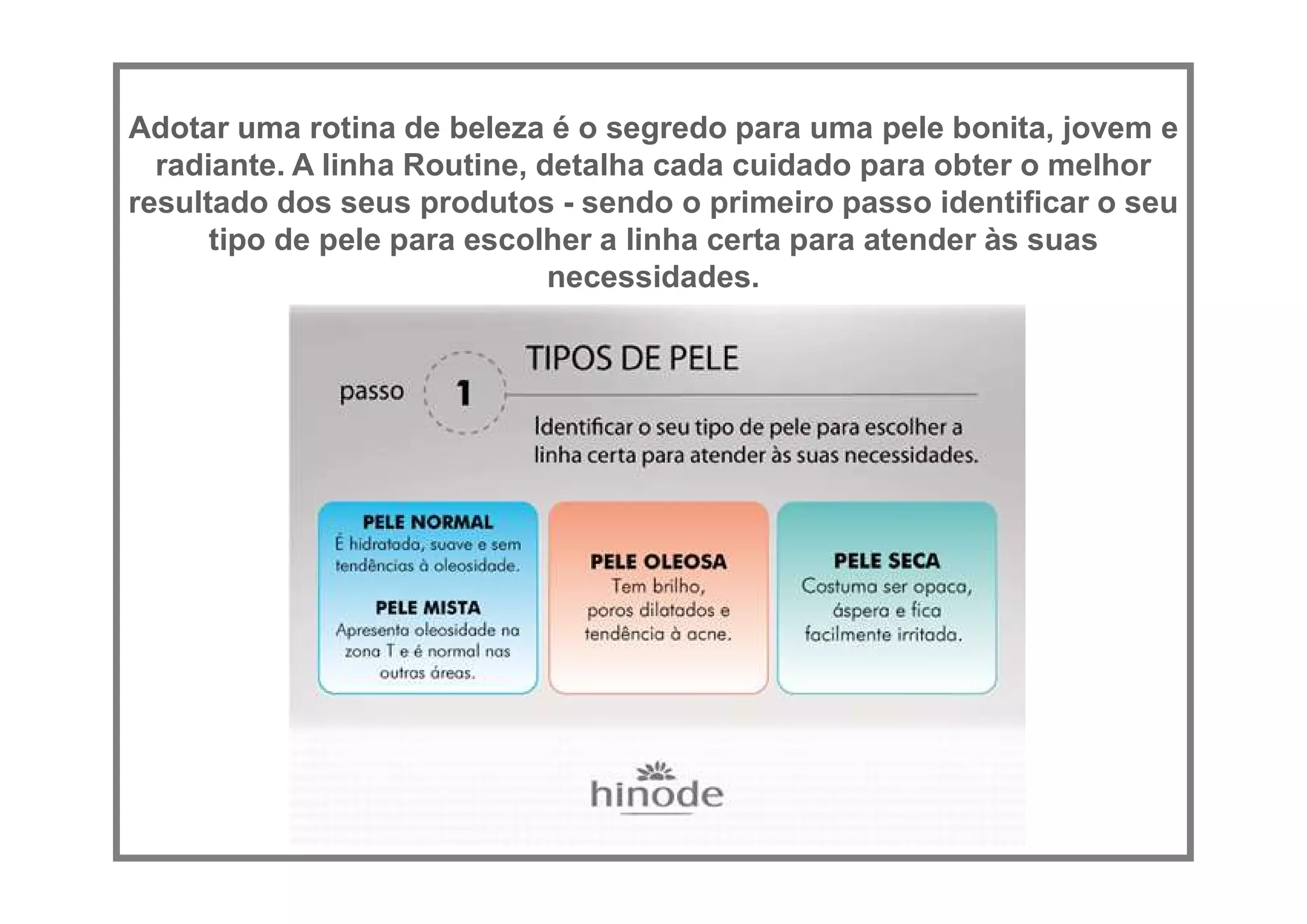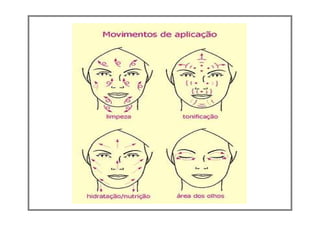 O documento descreve uma linha completa de produtos para cuidados com a pele, incluindo demaquilante, gel de limpeza, esfoliante, tônico, hidratante, máscaras faciais, produtos anti-idade e kits de tratamento para diferentes tipos de pele. É fornecido detalhes sobre os benefícios e uso de cada produto, assim como preços e pontos para consultores.