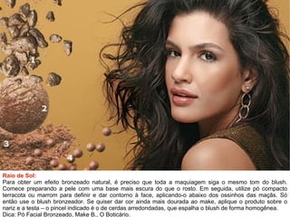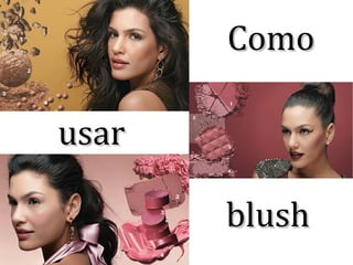 Para um efeito bronzeado natural, aplique blush bronzeador nas maçãs do rosto e sobre o nariz e testa após usar base e pó compacto terracota ou marrom. Para um rubor suave, use blush cremoso ou em musse em tons de rosa nas maçãs do rosto. Para uma noite de festa, invista em blush compacto nos tons vinho, cereja ou bordô aplicado nas têmporas com pincel chanfrado.