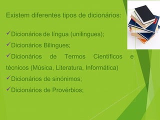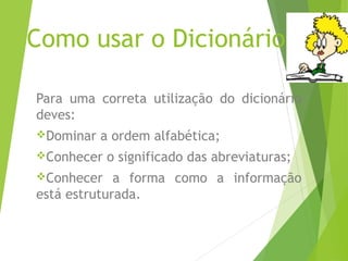 O documento fornece instruções sobre como usar dicionários de forma eficaz, incluindo dominar a ordem alfabética, conhecer abreviaturas e a estrutura da informação. Também lista diferentes tipos de dicionários e fornece dicas sobre como procurar palavras rapidamente e entender as regras de apresentação.