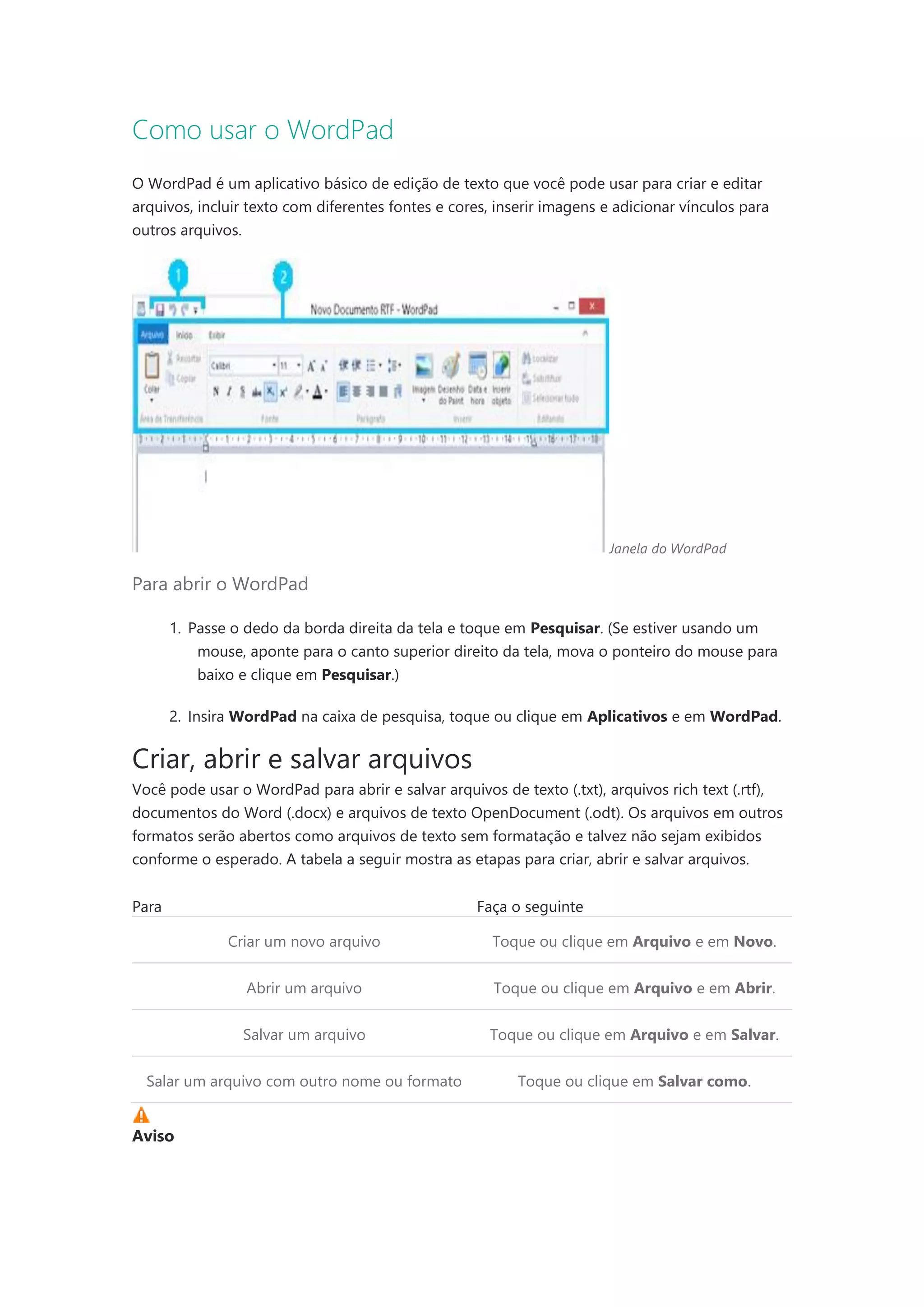 O documento fornece instruções sobre como usar o WordPad para editar documentos de texto, incluindo como abrir e salvar arquivos, formatar texto, inserir imagens e vínculos, exibir e imprimir arquivos. Ele explica os recursos básicos do WordPad e suas limitações em relação a recursos mais avançados do Microsoft Word.