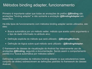 O documento explica três tipos de métodos binding adapter no Android: 1) busca automática por métodos setters, 2) definição explícita de métodos usando @BindingMethods, 3) definição de lógica com @BindingAdapter. Anotações @Binding permitem customizar métodos setters. @BindingMethods direciona métodos para atributos específicos. @BindingAdapter define lógica para escolher métodos.