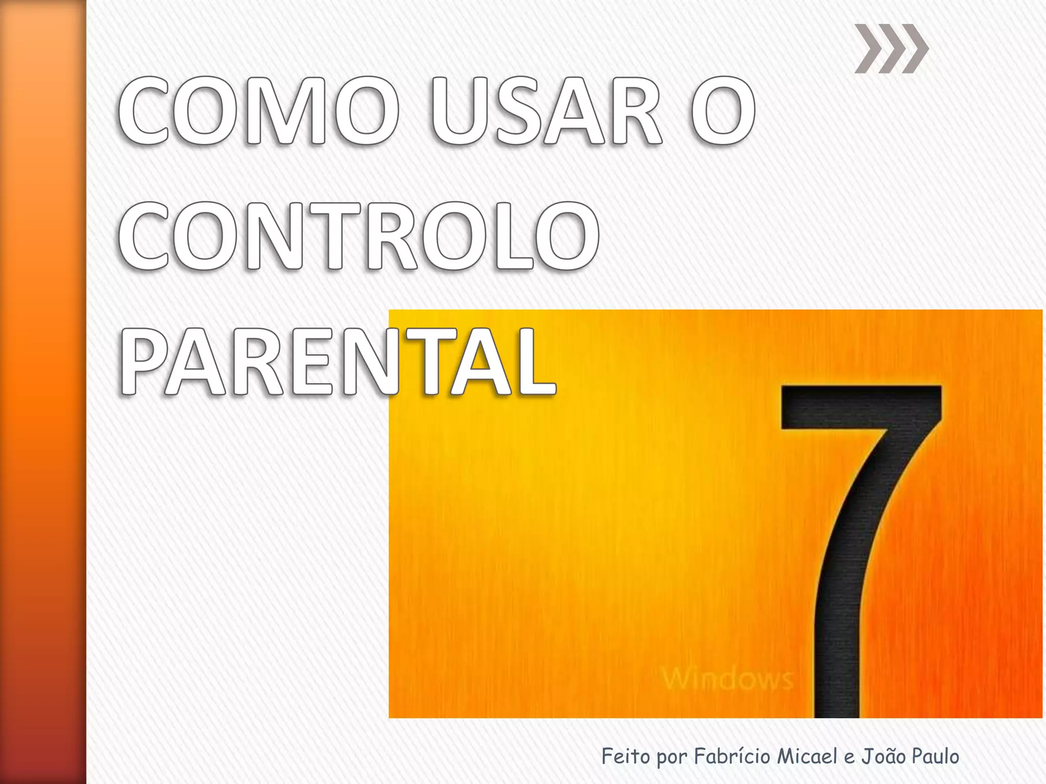 O documento descreve como o controle parental pode bloquear o acesso a programas e definir horários de uso do computador para qualquer pessoa. Ele foi escrito por Fabrício Micael e João Paulo.
