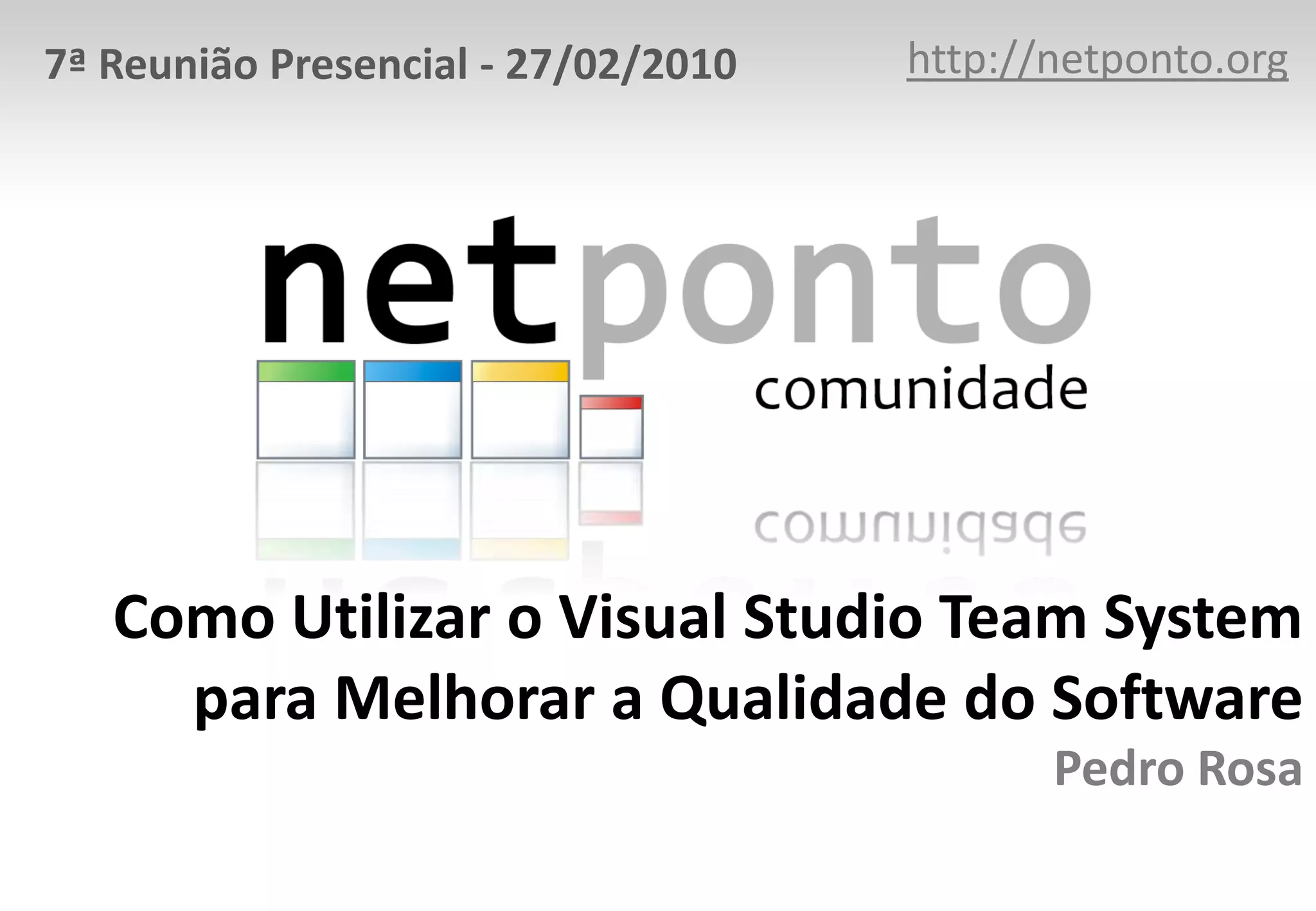 A apresentação discutiu como utilizar as ferramentas do Visual Studio Team System para melhorar a qualidade do software, sem o uso de slides. A próxima reunião presencial será em março no Porto e os participantes são encorajados a reservar as datas futuras em suas agendas.