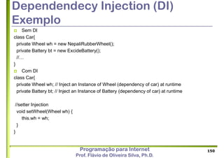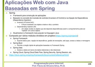 O documento apresenta uma visão geral do Spring Framework e Spring Boot, focando em conceitos como Inversão de Controle (IoC) e Injeção de Dependência (DI). Inclui exemplos de implementação e detalha diferentes módulos e anotações usados no desenvolvimento de aplicações web em Java. Além disso, aborda como o Spring Data permite a persistência de dados e operações CRUD utilizando JPA.