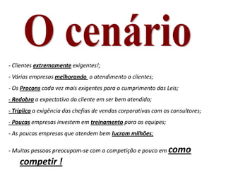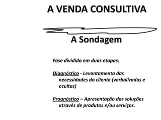O documento fornece orientações sobre vendas consultivas em 6 passos: 1) pré-venda, 2) abertura, 3) sondagem, 4) negociação, 5) fechamento e 6) pós-vendas. Cada passo é detalhado com dicas para diagnosticar necessidades do cliente, apresentar soluções, negociar e fechar a venda de forma efetiva, gerando fidelidade por meio de um bom pós-vendas.