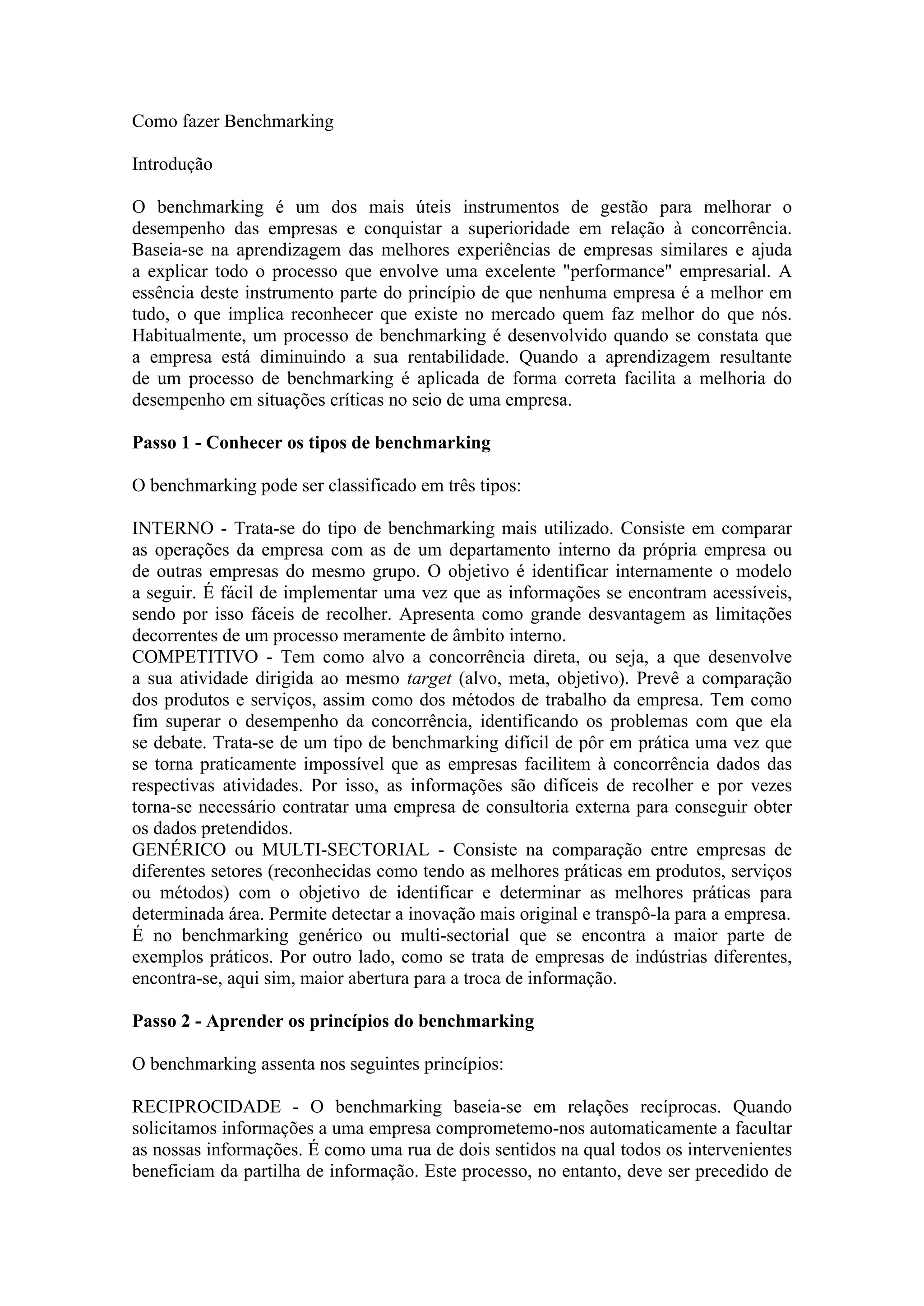 O documento descreve as etapas para realizar benchmarking, que incluem: 1) conhecer os tipos de benchmarking, 2) aprender os princípios, 3) aplicar o processo em 4 etapas, 4) formar equipes, 5) implementar ações, e 6) colher benefícios. O objetivo final é melhorar o desempenho da empresa e alcançar uma posição de liderança no mercado.