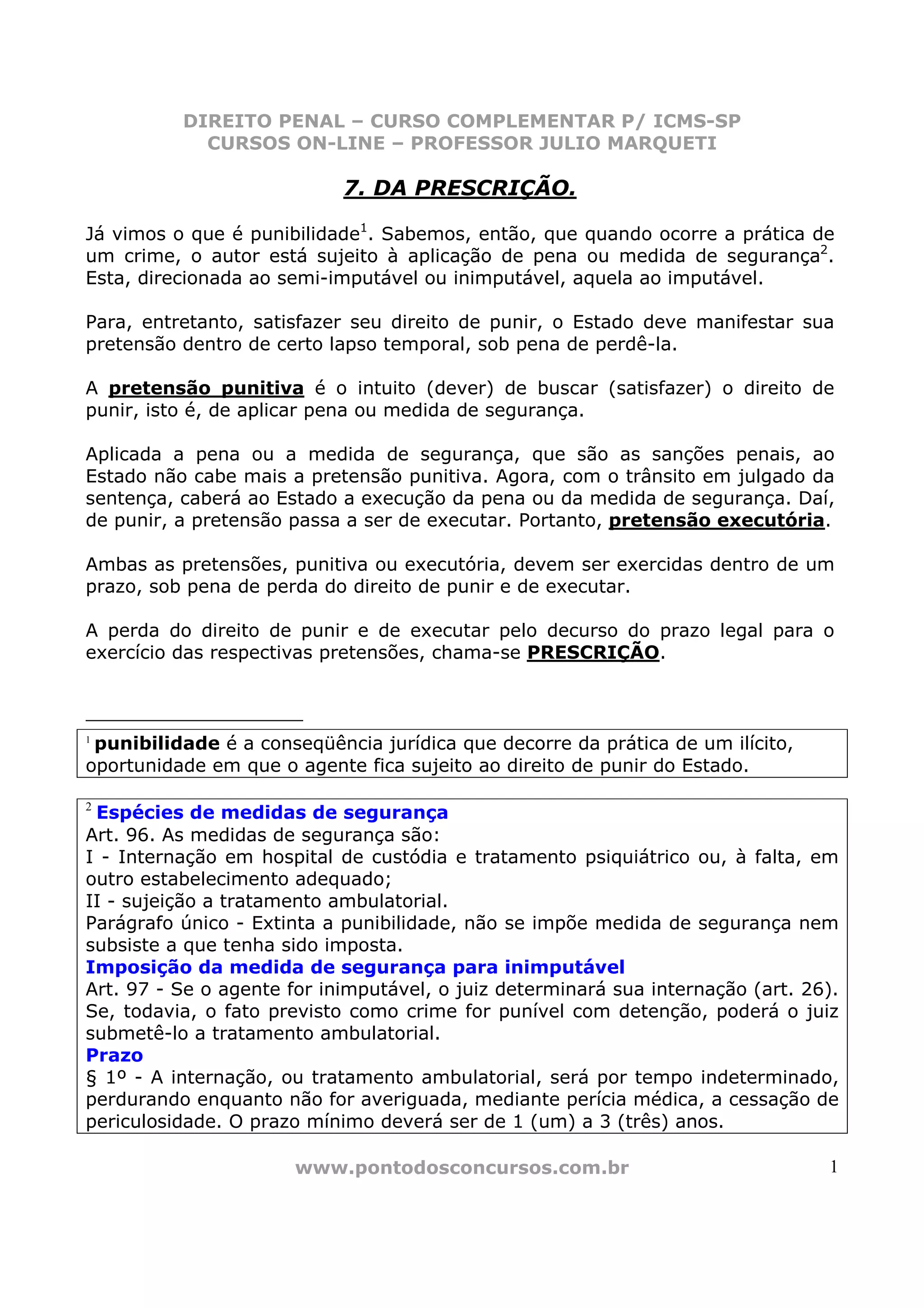 1. O documento discute o tema da prescrição no direito penal, que é a perda do direito do Estado de punir ou executar uma pena pelo decurso do tempo.