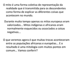 Este documento compara a mitologia africana e grega, destacando semelhanças entre deuses de ambas as mitologias, como Oxalá e Zeus, Nanã e Hades, Iemanjá e Poseidon. A autora argumenta que houve influências entre as mitologias africana e européia devido ao contato entre essas populações.