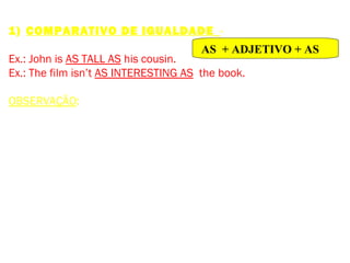 O documento explica as formas de comparar e usar graus de comparação em adjetivos e advérbios em inglês. Detalha as regras para formação do comparativo e superlativo de igualdade, inferioridade e superioridade dependendo do número de sílabas do adjetivo ou se o advérbio termina em "ly". Apresenta também exceções irregulares.