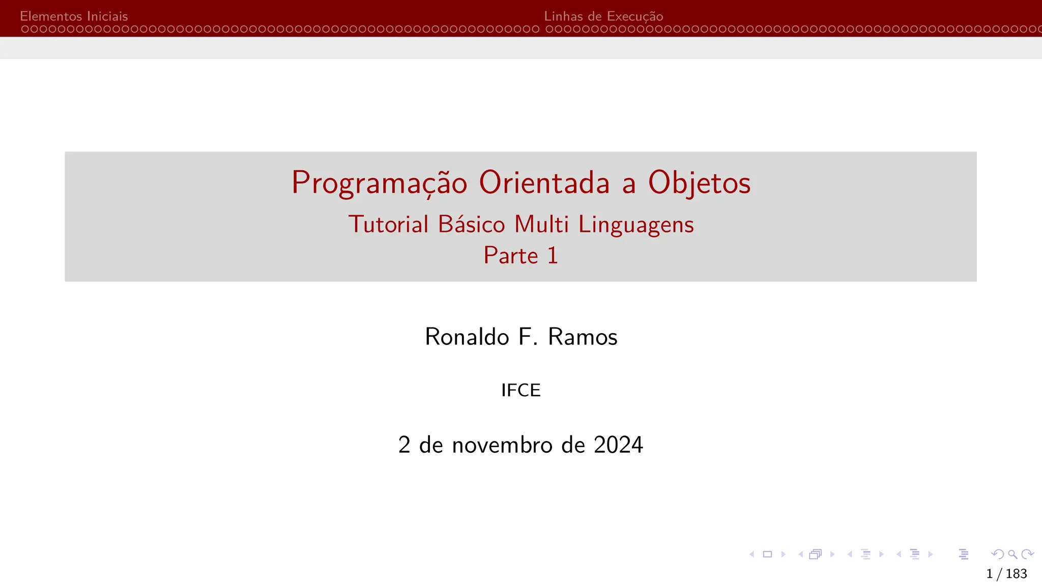 O documento é um tutorial introdutório sobre programação orientada a objetos, abordando elementos iniciais, linhas de execução e exemplos práticos em linguagens como C++, Java e Python. Ele discute conceitos como namespaces, tipos de dados, arrays e manipulação de strings, além de apresentar exemplos de códigos e suas respectivas compilações e execuções. O conteúdo também compara características das três linguagens em termos de tipagem, conversão de tipos e operadores aritméticos.