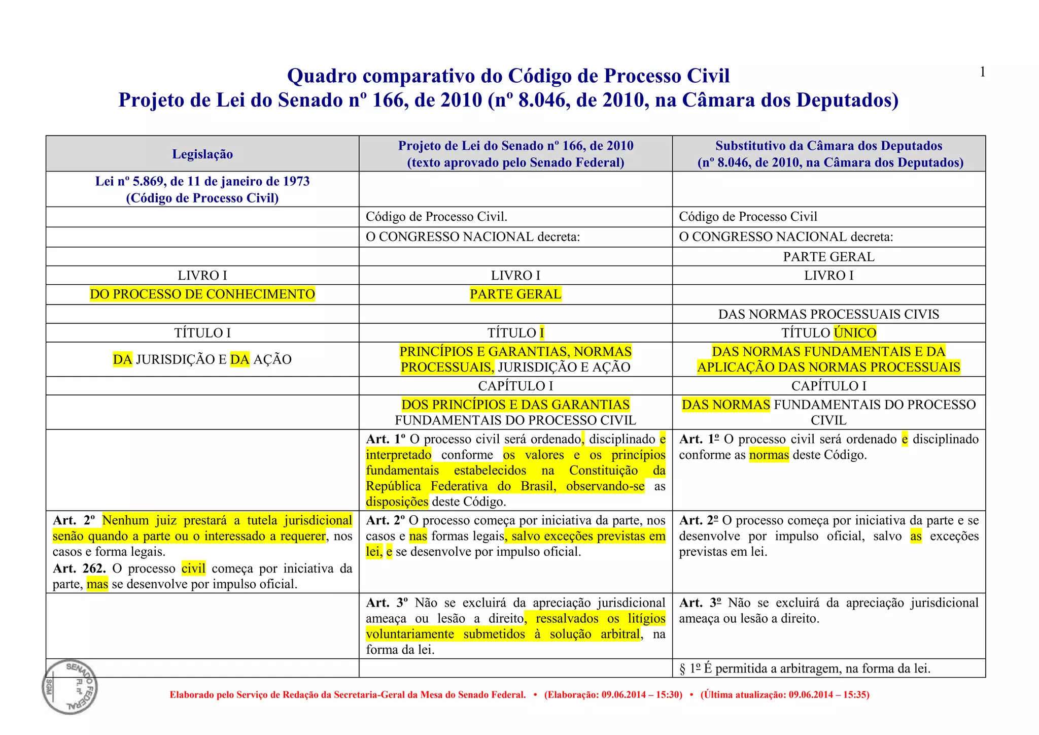 O documento apresenta um quadro comparativo entre o Código de Processo Civil vigente e o Projeto de Lei do Senado nº 166 de 2010, que inclui substitutivos da Câmara dos Deputados. Ele aborda princípios fundamentais do processo civil, a iniciativa do processo pelas partes, a necessidade de tutela jurisdicional e a função do juiz, enfatizando a celeridade e a justiça na solução de conflitos. Além disso, analisa normas processuais e a jurisdicionalidade, destacando a paridade entre as partes e a publicidade nas decisões judiciais.