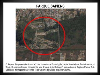 O documento discute diversos parques tecnológicos localizados no Brasil, incluindo o Parque Sapiens em Florianópolis. Os parques objetivam estimular o desenvolvimento científico e tecnológico de suas regiões, atraindo empresas e gerando empregos. Muitos contam com parcerias público-privadas e buscam integrar atividades de pesquisa, inovação e lazer de forma sustentável.