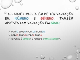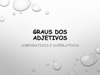 O documento discute os graus dos adjetivos em português - grau normal, comparativo e superlativo. Explica como cada grau expressa qualidades e comparações, e fornece exemplos. Também lista formas irregulares na formação de alguns superlativos absolutos sintéticos e pede para completar frases com adjetivos nos graus apropriados.