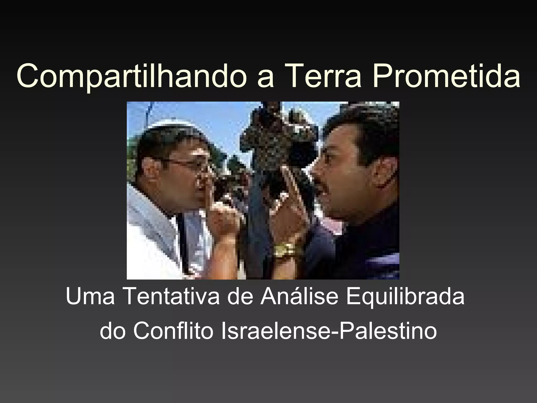 O documento discute o conflito israelense-palestino, reconhecendo que ambos os lados têm reivindicações históricas, culturais e religiosas sobre a Terra Santa. A única solução viável é a existência de dois Estados independentes, Israel e Palestina, vivendo lado a lado com fronteiras seguras, porém o processo de paz de Oslo fracassou devido à falta de confiança entre os lados e à intolerância de alguns grupos.