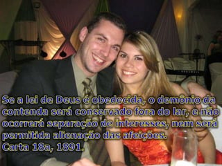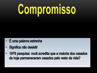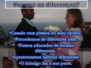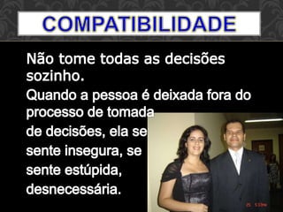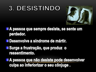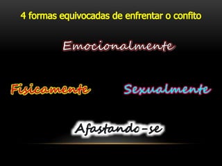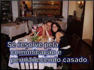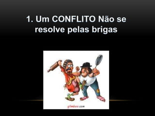 O documento discute resolução de conflitos em casamentos. Ele sugere que conflitos são normais, mas não devem ser resolvidos através de brigas ou divórcio. Ao invés disso, recomenda conversar na hora certa, saber ouvir, se concentrar no problema principal e assumir responsabilidade para resolver problemas.