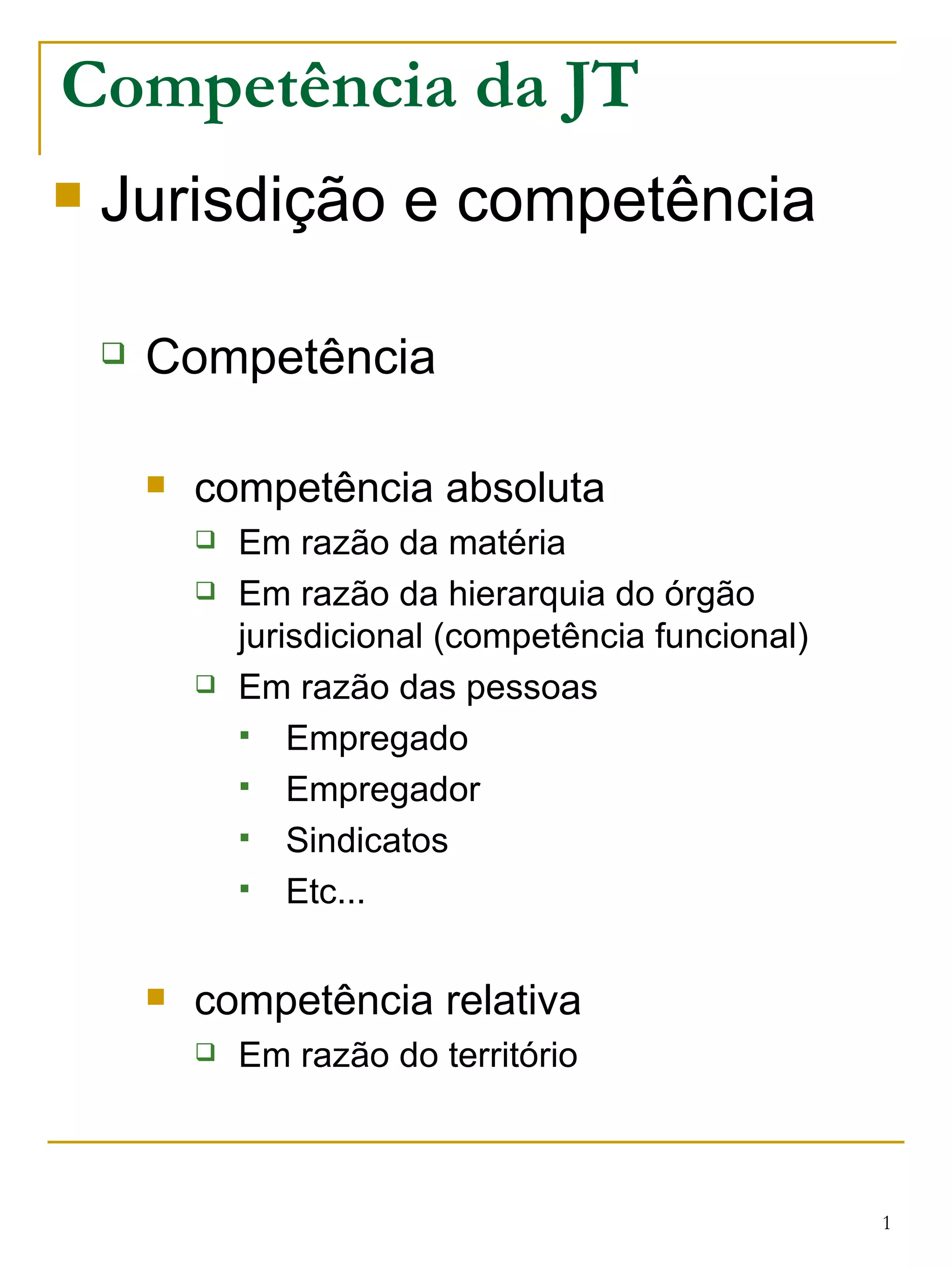 A Justiça do Trabalho tem competência absoluta sobre questões trabalhistas em razão da matéria e das pessoas envolvidas, como empregados e empregadores. Sua competência também se estende a questões territoriais de acordo com a localização da prestação de serviços ou atividades do empregador. A competência da Justiça do Trabalho abrange diversas ações e controvérsias decorrentes da relação de trabalho.
