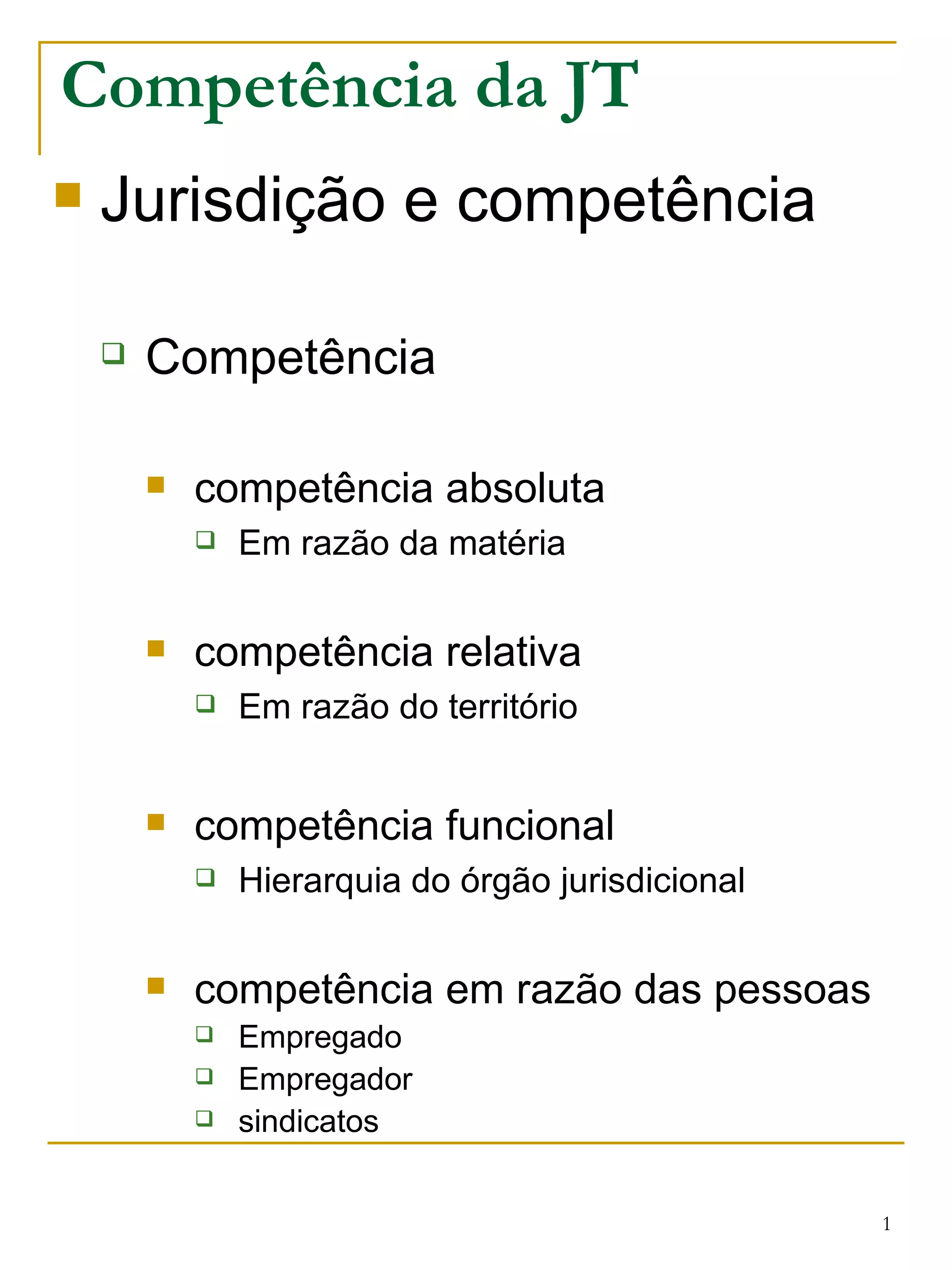1) A Justiça do Trabalho tem competência absoluta sobre questões trabalhistas decorrentes da relação de trabalho. 2) Sua competência também se estende a entes de direito público, questões de greve, representação sindical e outras controvérsias relacionadas ao trabalho. 3) A competência territorial se dá pelo local da prestação de serviços, podendo ser um ou vários locais.