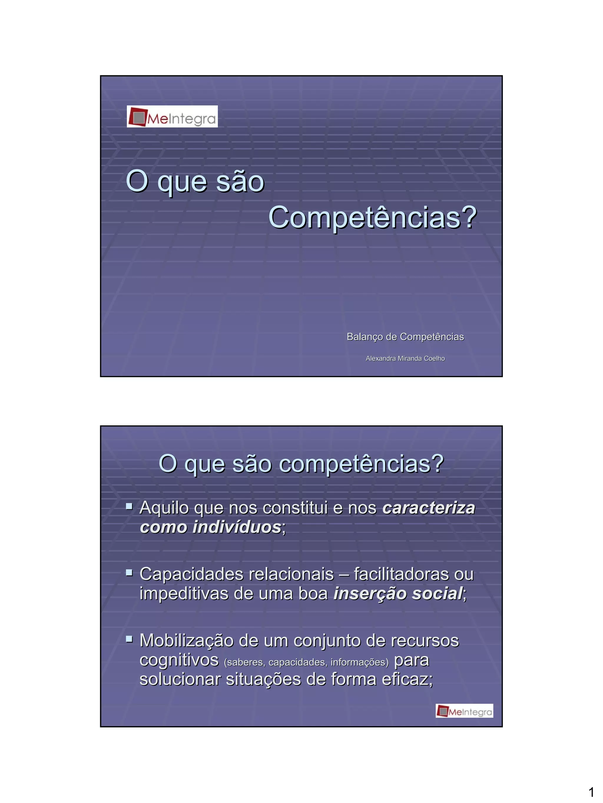 O documento define competências como: 1) a capacidade de mobilizar conhecimentos e habilidades para resolver problemas de forma eficaz; 2) o conjunto de conhecimentos, qualidades e capacidades que permitem executar tarefas de forma adequada; 3) a capacidade de aplicar saberes em contextos específicos.