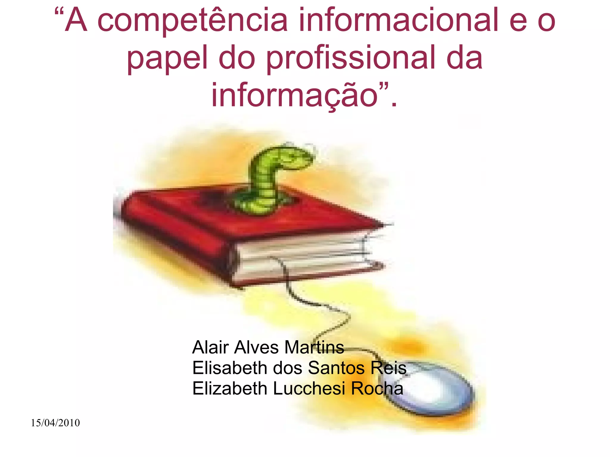 O documento discute a competência informacional e o papel do profissional da informação, definindo competência informacional como a capacidade de identificar, localizar, obter, avaliar, organizar e utilizar informação para solucionar problemas e construir conhecimento. Também destaca as competências necessárias para os profissionais da informação, como atualização constante e saber transmitir informações de maneira adequada, e as ações educacionais que podem ser usadas para divulgar informações.