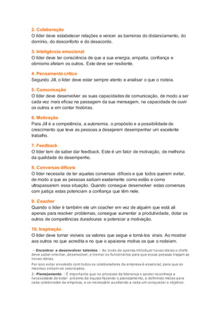 1. O documento discute as competências necessárias para líderes, divididas em técnicas, comportamentais e estratégicas.