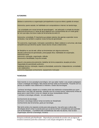 As principais competências dos estudantes para trabalhar em programas de ensino-aprendizagem mediados por tecnologia incluem: 1) autonomia, organização e motivação; 2) conhecimento básico de tecnologia e habilidades digitais; 3) curiosidade e disposição para aprender novas formas de aprendizagem.