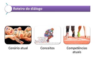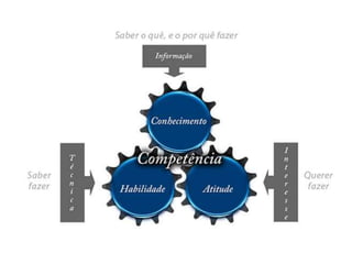 O documento discute competências profissionais e pessoais valorizadas pelo mercado de trabalho. Ele lista competências como trabalho em equipe, liderança, comunicação, criatividade, planejamento e marketing pessoal. Também discute características pessoais importantes como autoconhecimento, flexibilidade, ética, visão holística e compartilhamento de conhecimento.