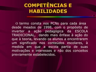 O documento discute competências e habilidades no contexto educacional. Define competência como um conjunto de conhecimentos, habilidades e atitudes que permitem resolver situações com pertinência. As habilidades são meios para atingir objetivos e desenvolver competências. O currículo deve priorizar competências e contextualizar conteúdos para que os alunos desenvolvam habilidades cognitivas de observação, realização e compreensão.