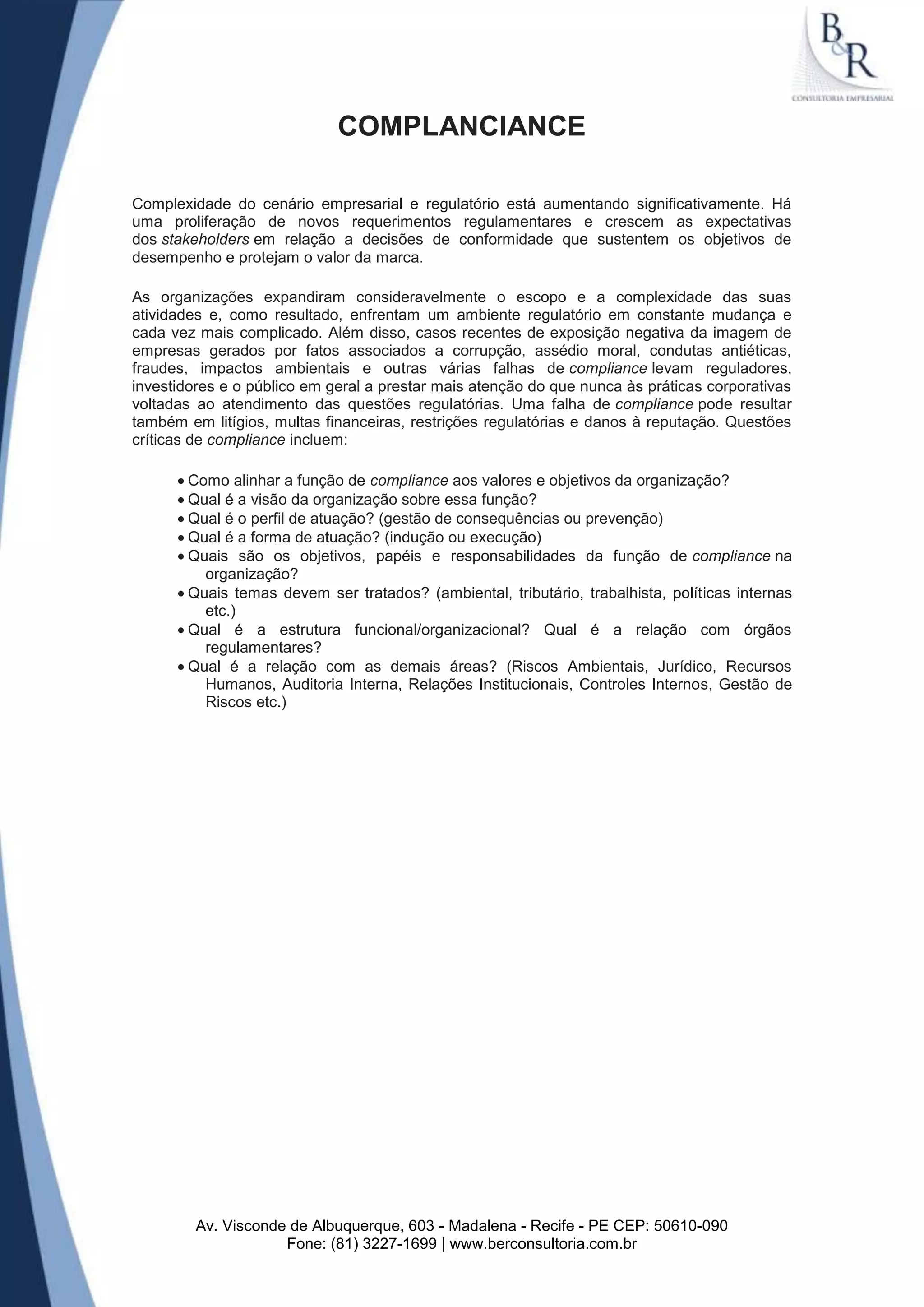 O documento discute como o cenário empresarial e regulatório está se tornando mais complexo, com mais requisitos regulatórios e expectativas de stakeholders. Isso força as organizações a lidarem com um ambiente regulatório em constante mudança. Falhas de compliance podem resultar em litígios, multas e danos à reputação. O texto lista questões-chave de compliance que as organizações devem considerar.