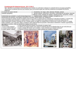 O documento discute como os sistemas técnicos moldam o espaço geográfico e como a sociedade muda ao longo do tempo. Ele explica que o Brasil se originou no Nordeste por meio da pecuária e da cana-de-açúcar, e desde então vários sistemas técnicos transformaram gradualmente o espaço, incluindo a cotonicultura, extrativismo, indústria, agroindústria e agronegócio. Os sistemas técnicos atuais, como a alta tecnologia, também mudam