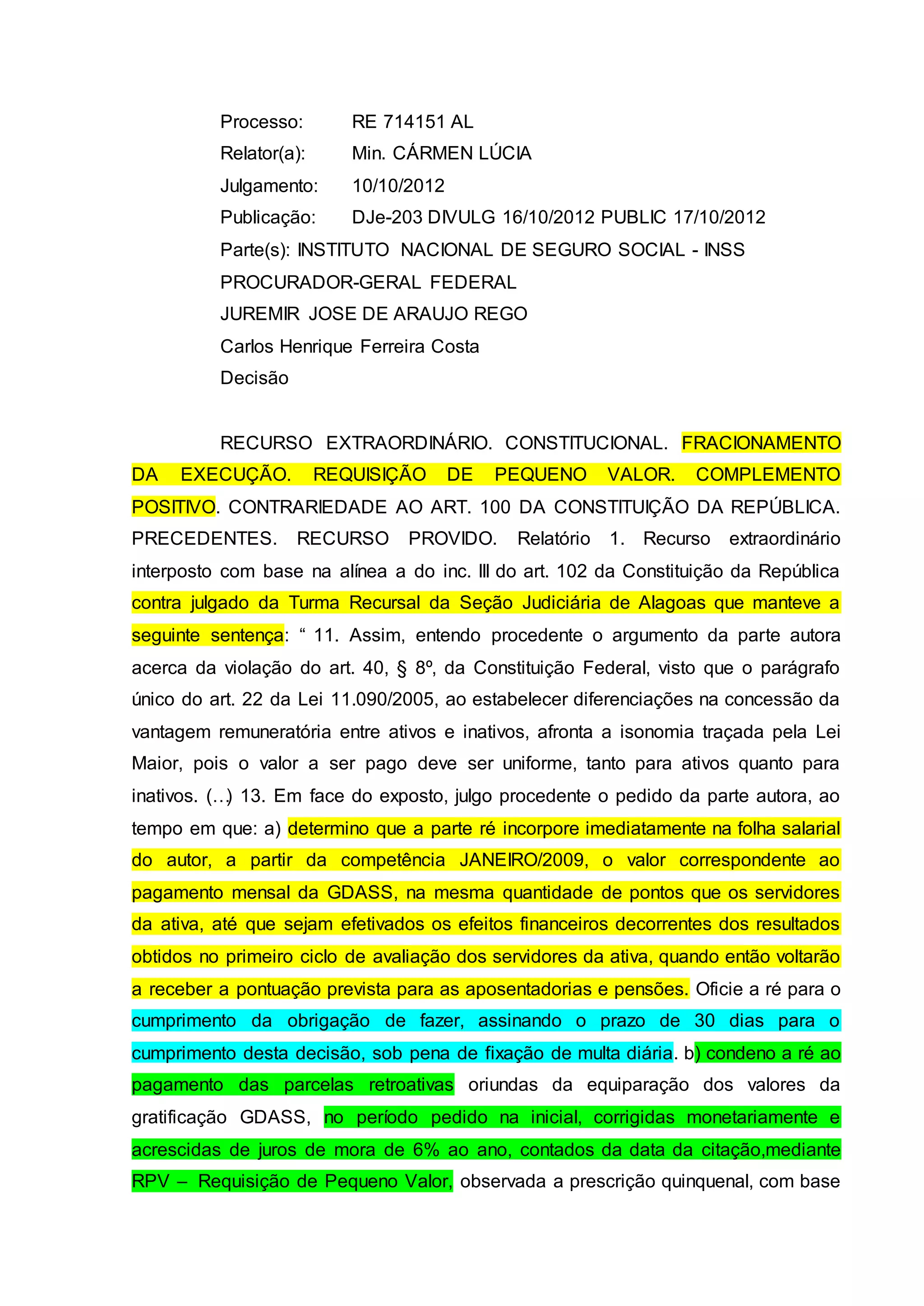 O documento trata de dois processos judiciais relacionados a pagamentos de benefícios previdenciários. No primeiro, o STF determinou que valores atrasados pagos por meio de complemento positivo ou precatório não podem ser fracionados. No segundo, a Justiça entendeu que valores atrasados de benefícios previdenciários pagos via precatório estão isentos de Imposto de Renda, pois se pagos em dia também estariam isentos.