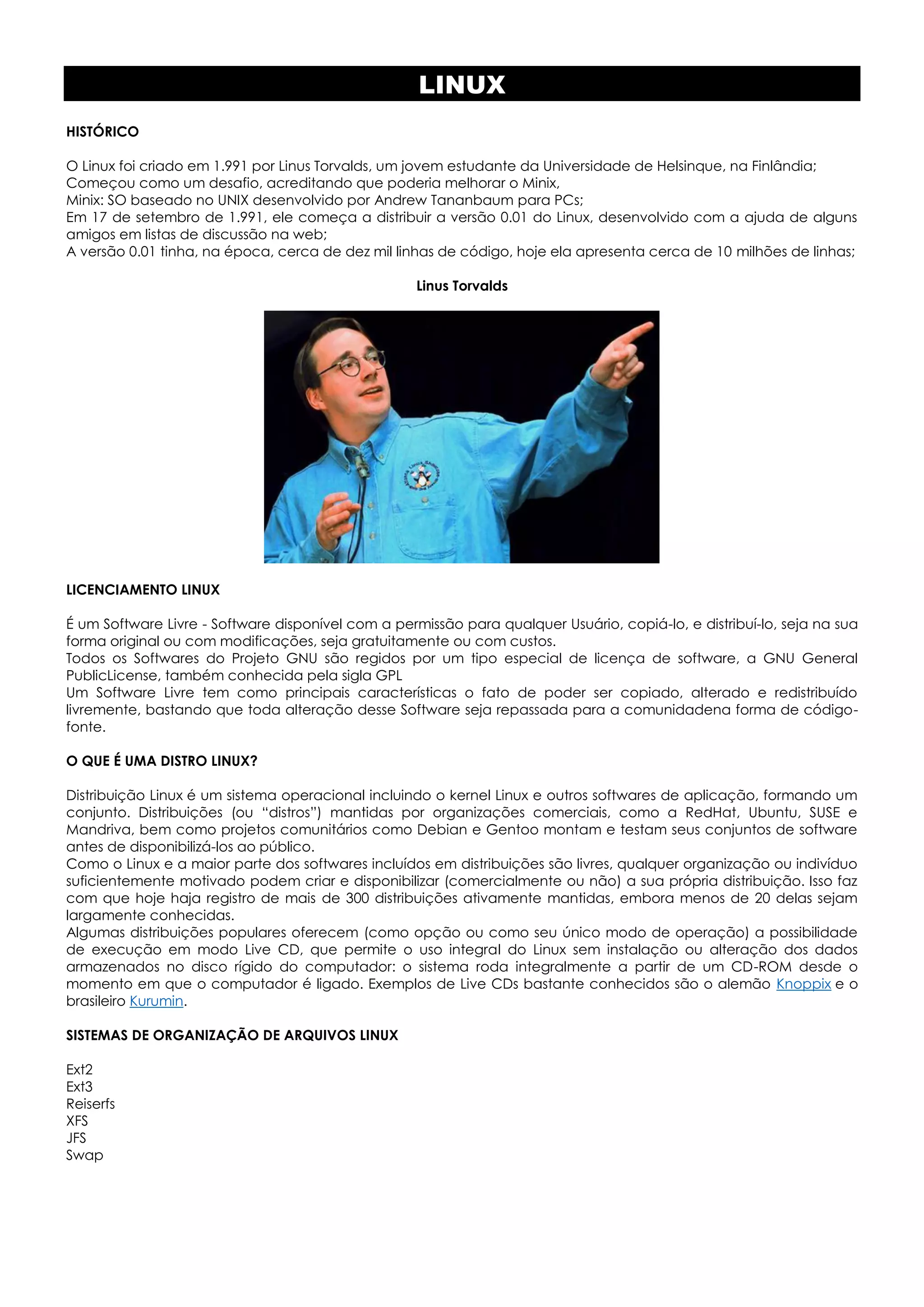 [1] O Linux foi criado em 1991 por Linus Torvalds na Finlândia como um desafio para melhorar o Minix. [2] É um software livre com código aberto sob a licença GPL. [3] Uma distro Linux é um sistema operacional que inclui o kernel Linux e outros softwares, formando um conjunto testado e disponibilizado por organizações ou projetos comunitários.