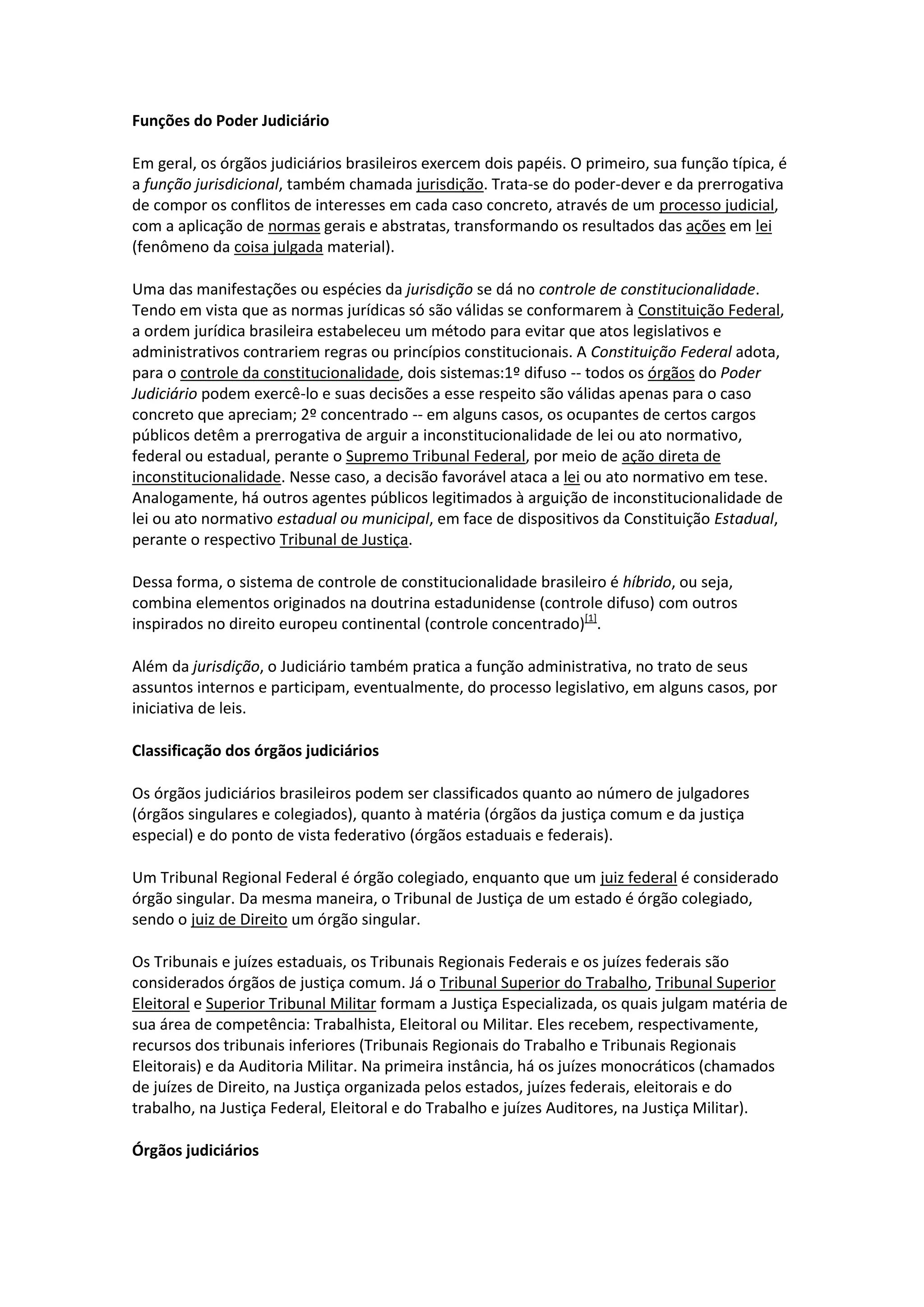 O documento descreve as funções do Poder Judiciário brasileiro. Ele exerce funções jurisdicionais, como julgar casos, e administrativas, como gerenciar seus próprios assuntos. O sistema judiciário brasileiro é composto por vários órgãos que operam nos níveis federal, estadual e municipal. A Constituição Federal estabelece princípios como imparcialidade e independência para garantir o bom funcionamento do Poder Judiciário.