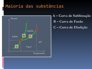 Maioria das substânciasSólido Vapor gás Líquido 1 2 A B C Pressão Temperatura A – Curva de Sublimação B – Curva de Fusão C – Curva de Ebulição