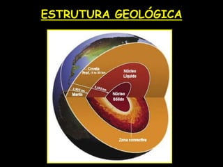 O documento descreve a estrutura geológica e os principais agentes que modelam o relevo terrestre no Brasil. Apresenta os principais planaltos e planícies brasileiros formados por rochas cristalinas e sedimentares, modelados por processos internos como tectonismo e vulcanismo, e externos como a ação da água, vento, gelo e seres vivos. Destaca também a influência das atividades humanas na modificação do relevo.