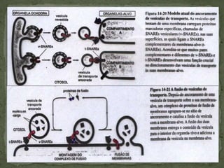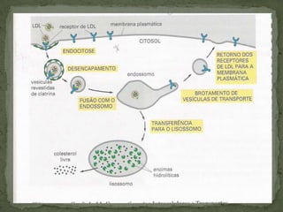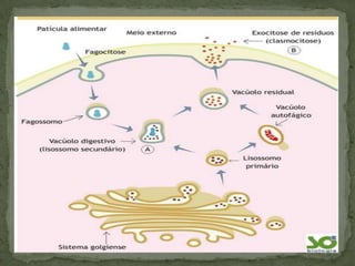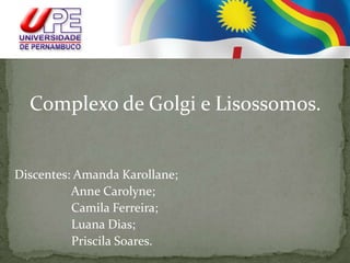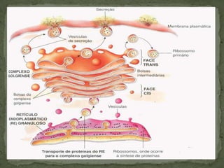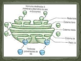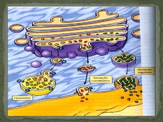 O documento descreve o Complexo de Golgi e Lisossomos. O Complexo de Golgi é uma organela responsável pela síntese e processamento de carboidratos e proteínas. Os lisossomos contêm enzimas hidrolíticas que digerem materiais internalizados e organelas danificadas, e desempenham um papel importante na digestão e reciclagem de componentes celulares.