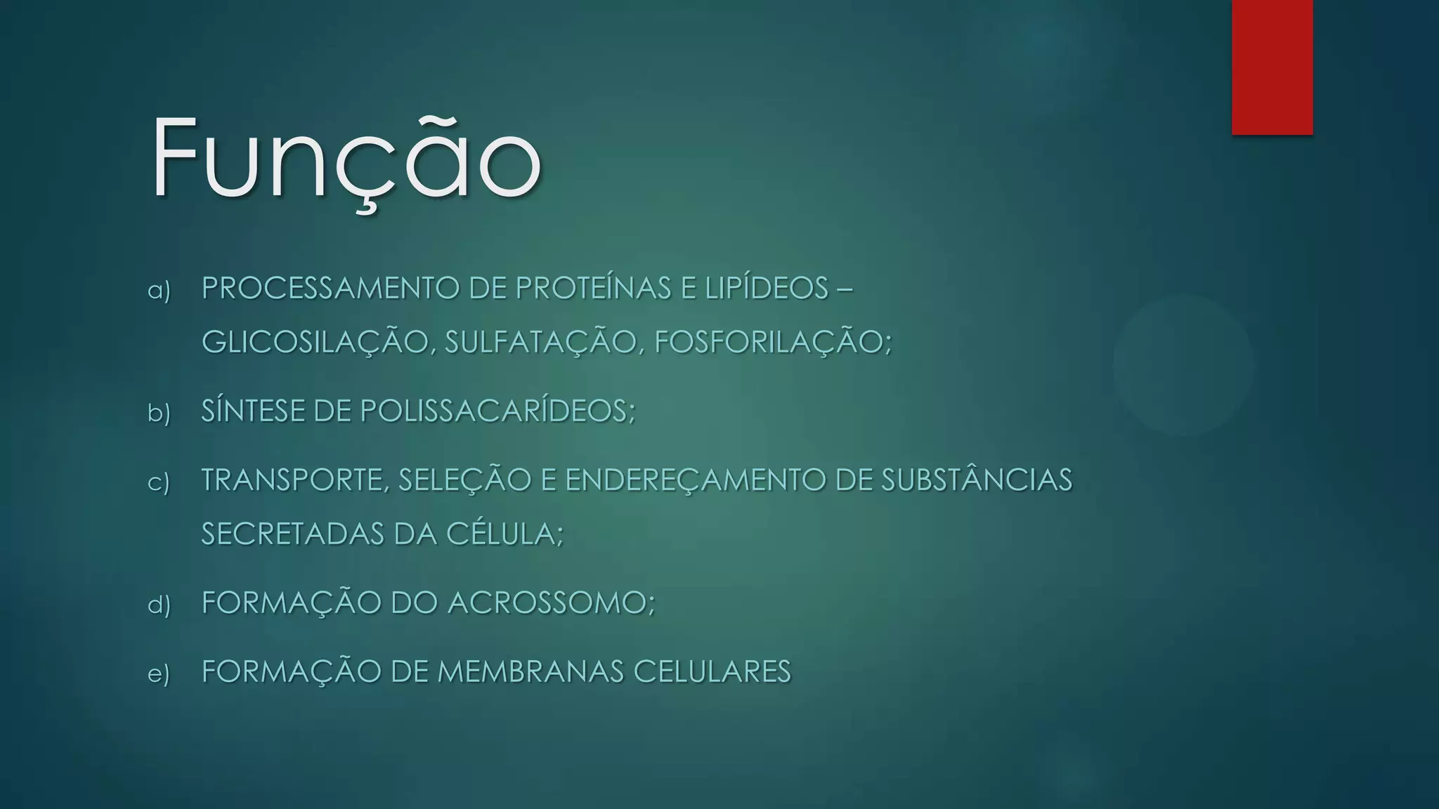 O documento descreve as principais funções do complexo de Golgi, incluindo o processamento de proteínas e lipídios através de glicosilação, sulfatação e fosforilação. Também aborda a síntese de polissacarídeos, o transporte e endereçamento de substâncias secretadas e a formação do acrossomo e membranas celulares.