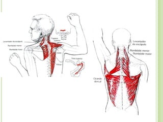 O documento descreve as articulações e os principais músculos do complexo do ombro, incluindo a articulação glenoumeral, escapulotorácica e os movimentos de flexão, extensão, abdução e rotação. Resume os principais pontos sobre cada articulação e os músculos responsáveis pelos movimentos do ombro.