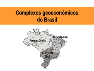 O documento descreve a divisão geoeconômica do Brasil em três grandes regiões - Amazônia, Nordeste e Centro-Sul. Detalha as características históricas, econômicas e problemas de cada região, incluindo a ocupação desigual ao longo do tempo, as superintendências criadas para promover o desenvolvimento regional e os principais produtos e atividades econômicas de cada uma.