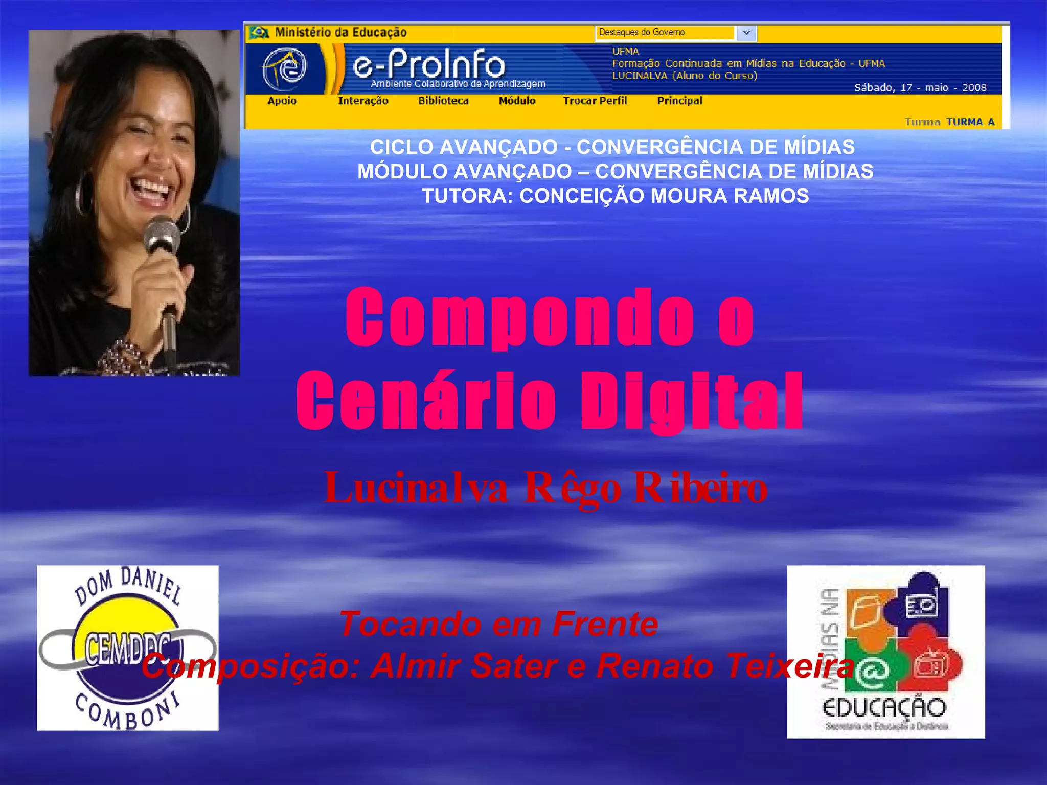 Este documento apresenta a letra da música "Tocando em Frente", de Almir Sater e Renato Teixeira. A letra reflete sobre a vida, o amor, a paz e a importância de seguir em frente apesar das dificuldades, aceitando que cada um constrói sua própria história.