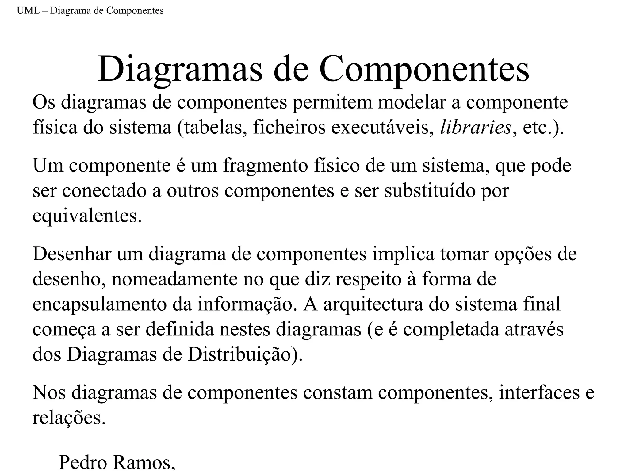 Os diagramas de componentes permitem modelar a estrutura física de um sistema em componentes como bibliotecas e executáveis. Um diagrama de componentes define a arquitetura do sistema e mostra como os componentes se conectam através de interfaces. Um diagrama de distribuição distribui esses componentes nos nós de hardware como computadores e dispositivos.