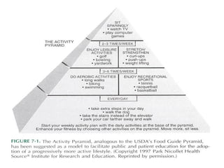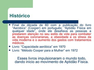 O documento discute a história e os benefícios da aptidão física relacionada à saúde. Começa com o livro "Aerobics" de Cooper na década de 1960 que popularizou exercícios aeróbicos. Descreve como a capacidade aeróbica, força muscular, flexibilidade e composição corporal são componentes importantes da aptidão física relacionada à saúde e como medir cada um.