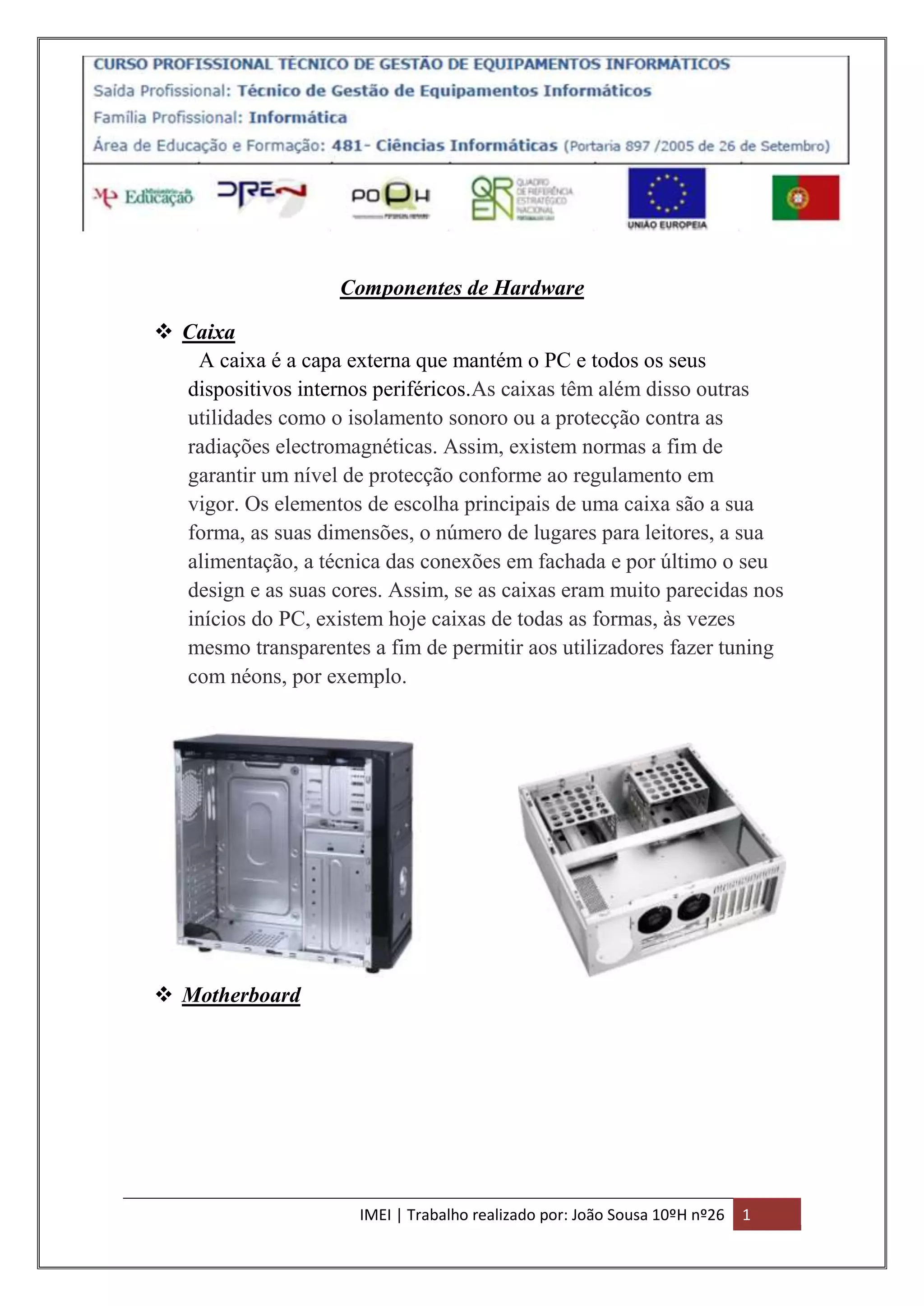 O documento descreve os principais componentes de hardware de um computador pessoal, incluindo a caixa, placa-mãe, memória RAM, processador, fonte de alimentação e leitores/gravadores de DVD e cartões de memória. Fornece detalhes sobre as funções e especificações técnicas destes componentes centrais para o funcionamento de um PC.