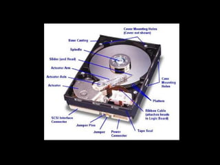 Este documento descreve os principais componentes internos de um computador, incluindo a fonte de alimentação, motherboard, processador, memória RAM, placa gráfica, disco rígido, cabos de barramento e placas opcionais como som, rede e drives ópticas. Cada componente é explicado brevemente em termos de sua função no computador.