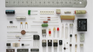 O documento discute componentes passivos e eletromecânicos, explicando que os componentes passivos não aumentam a intensidade da corrente ou tensão, mas interagem com a energia do circuito. Exemplos de componentes passivos incluem resistores, capacitores e indutores, enquanto componentes eletromecânicos combinam processos elétricos e mecânicos para produzir movimento, como motores e microfones. Além disso, os componentes eletromecânicos têm vida útil limitada e podem apresentar problemas de confiabilidade.