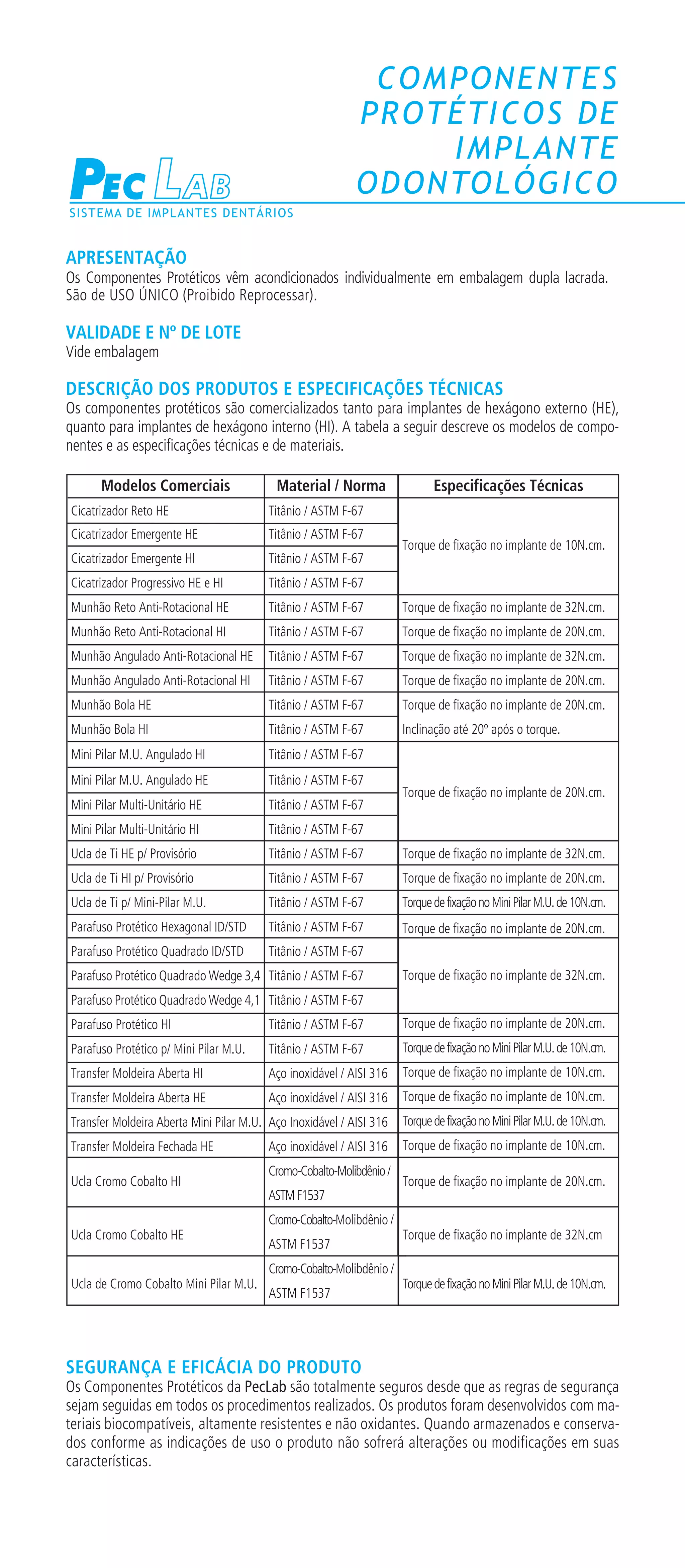 O documento apresenta componentes protéticos de implante odontológico, descritos em termos de especificações técnicas, materiais e indicações de uso. Os produtos são comercializados em embalagem estéril ou não, e é ressaltada a necessidade de seguir regulamentações de segurança, acondicionamento e esterilização. Além disso, aborda contraindicações, instruções de uso e precauções para garantir a eficácia e segurança dos implantes.