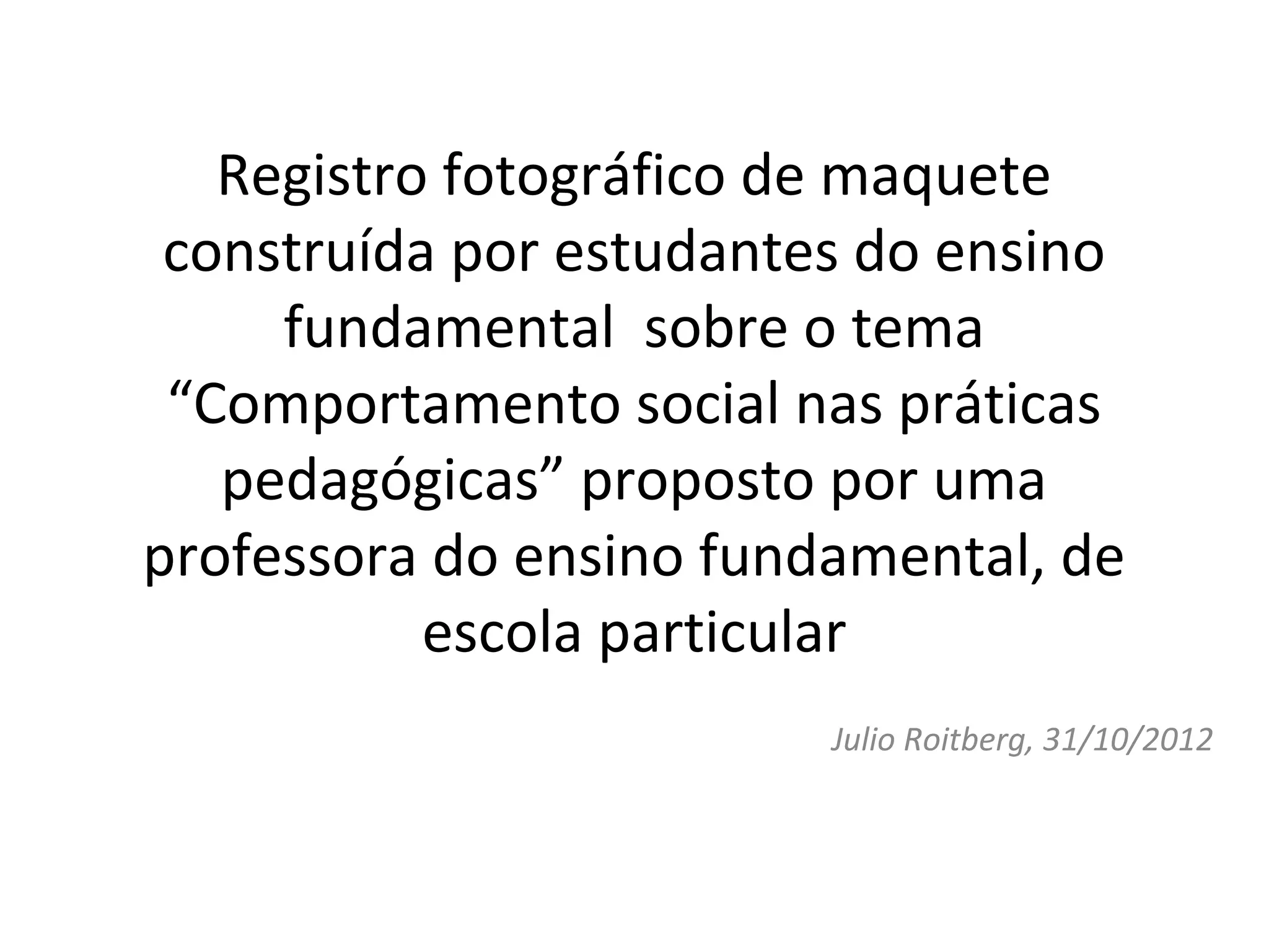 O documento apresenta um registro fotográfico de uma maquete desenvolvida por estudantes do ensino fundamental. A maquete aborda o tema 'comportamento social nas práticas pedagógicas'. Este projeto foi proposto por uma professora da escola particular Julio Roitberg em 31/10/2012.