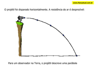 O documento discute o movimento de projéteis, explicando que ele pode ser decomposto em componentes horizontais e verticais que se movimentam independentemente. A componente horizontal se movimenta a velocidade constante enquanto a vertical é acelerada pela gravidade. Isso significa que um projétil lançado atingirá um alvo no mesmo tempo independente da velocidade horizontal.