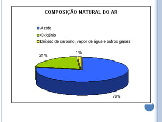 O documento descreve a composição do ar, explicando que é uma mistura de gases composta principalmente por nitrogênio (78%) e oxigênio (21%). O oxigênio é essencial para a combustão e respiração, enquanto a combustão libera energia química armazenada no combustível na forma de calor e luz.